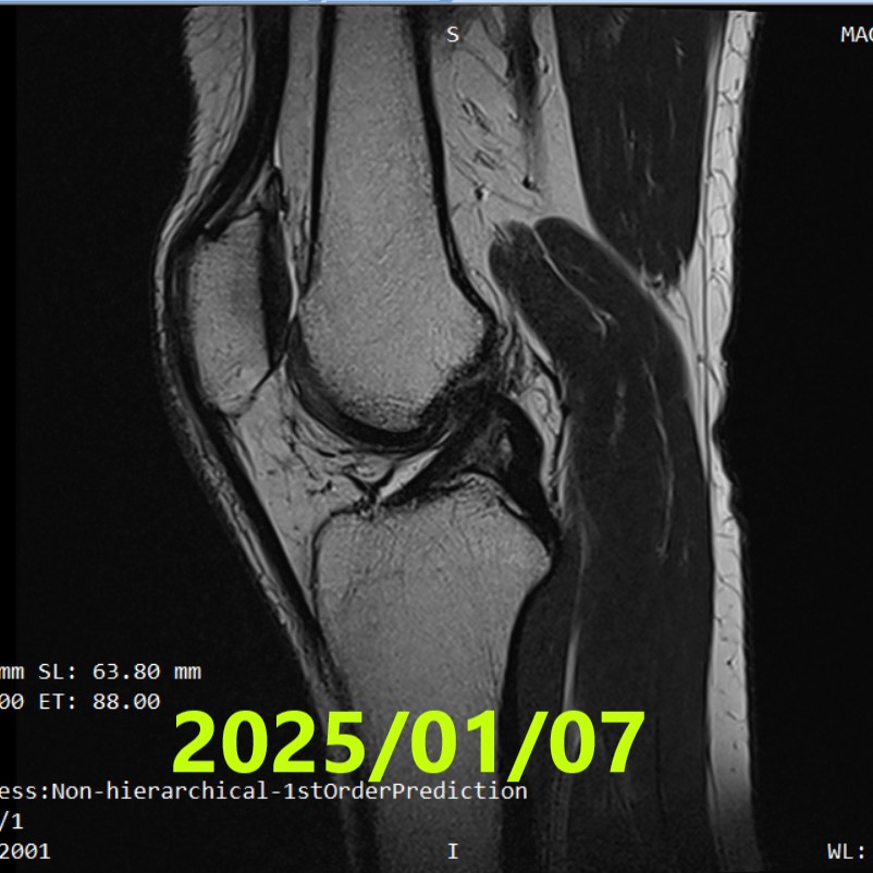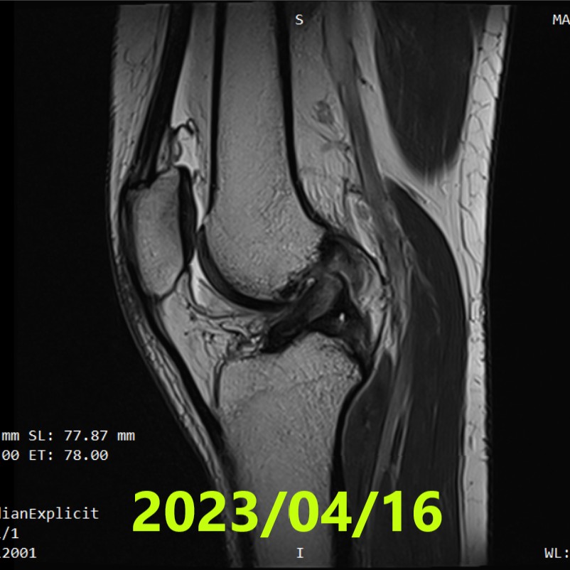 Lesión durante el baile: el ligamento cruzado anterior (LCA) se rompió por completo y el ligamento colateral medial (LCM) se lesionó de forma parcial. No se realizó cirugía. En su lugar, la paciente completó 3 meses de ejercicios Evo-Devo en línea ( evitar la extensión completa de la rodilla / ≤3.000 pasos al día / ejercicios en casa 3 veces al día ). A ~4 meses, la resonancia magnética (2023/8/27) confirmó la recuperación de la continuidad (ACLOAS 2). A ~21 meses (2025/1/7), la resonancia magnética sugirió una mayor progresión de la curación, pero no alcanzó ACLOAS 1. Las actividades diarias no presentaron problemas; el retorno al deporte aún no se ha confirmado.